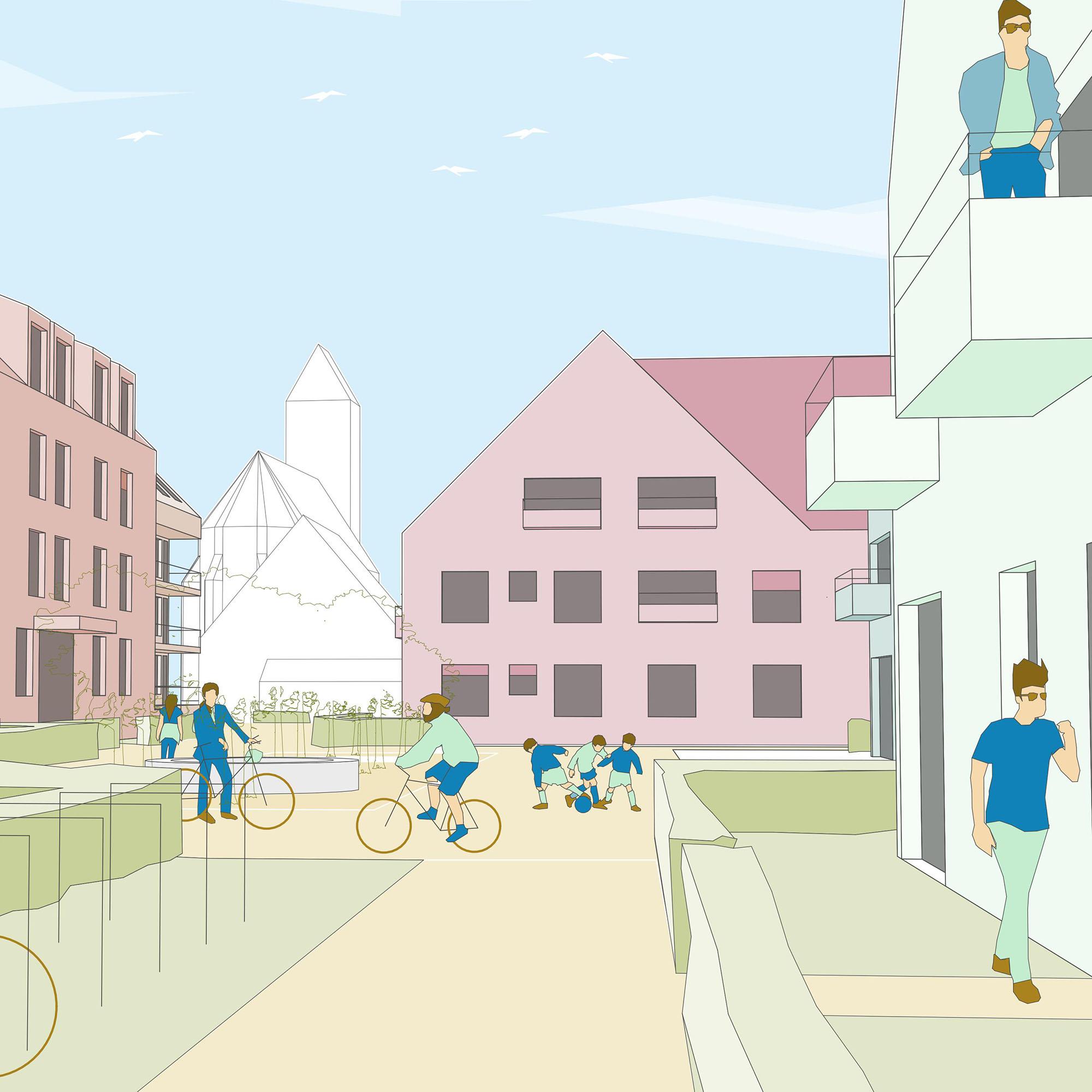 Die Wohnhäuser erhalten überwiegend 2 bis 3 m tiefe Vorgärten, die Abstand zu den gemeinschaftlichen Freiflächen schaffen. In den rückwärtigen Gemeinschaftsgärten entstehen Kleinkindspielflächen sowie vielfältig nutzbare Freiflächen mit Terrassen, Pflanzgärten und Rasenflächen.