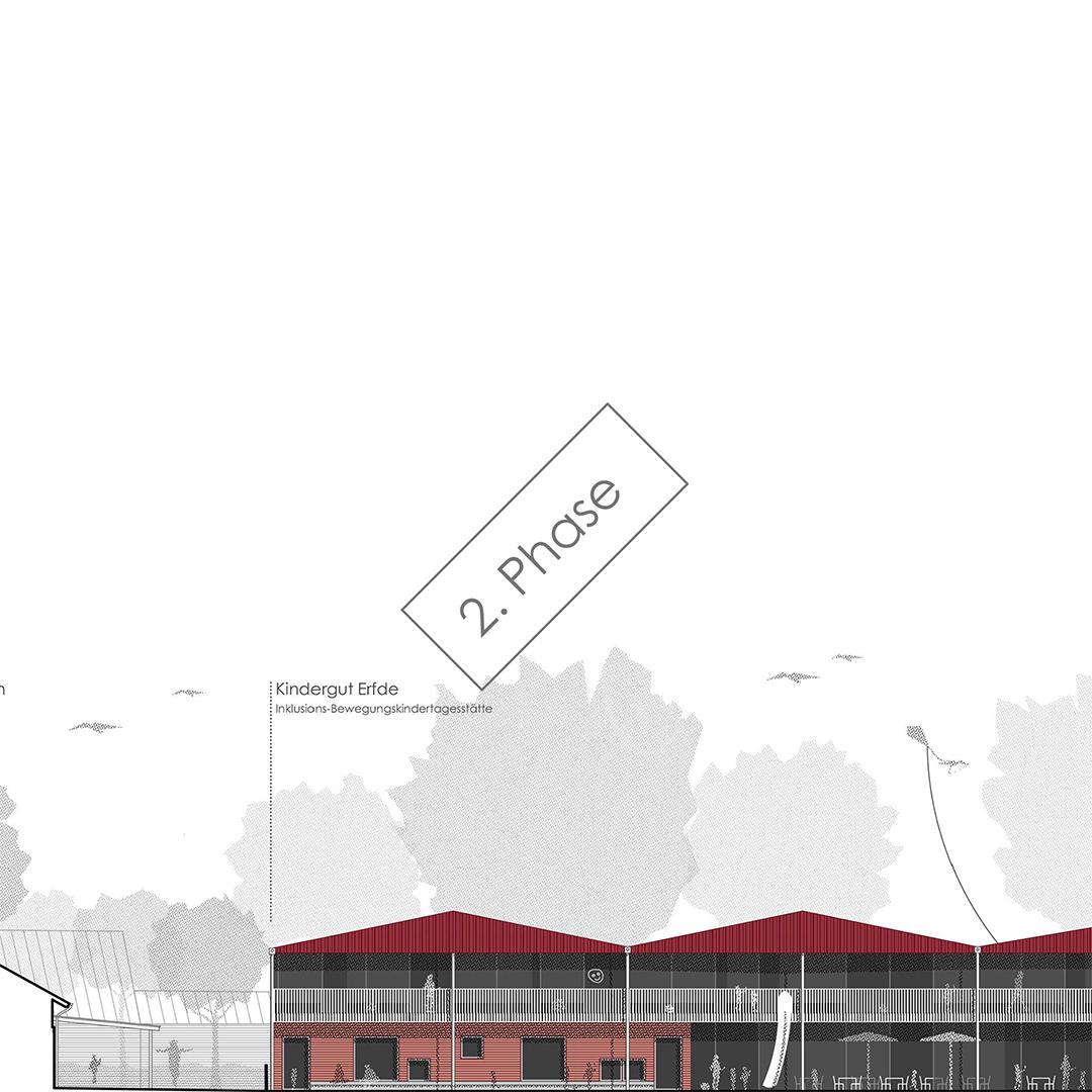 Der geplante Neubau ist winkelförmig ausgebildet. Gemeinsam mit dem Jugendzentrum umrahmt er den südlich gelegenen Spielhof. Es entsteht ein bauliches Ensemble, das an die Hofanlagen der schleswig-holsteinischen Geest anknüpft. Wir nennen es "Kindergut Erfde". Der Neubau ist so platziert, dass die südlich anschließenden Freianlagen für weitere Entwicklungen offengehalten werden. Eine Erweiterung unter Einbeziehung des südlich anschließenden Sportplatzes ist möglich.