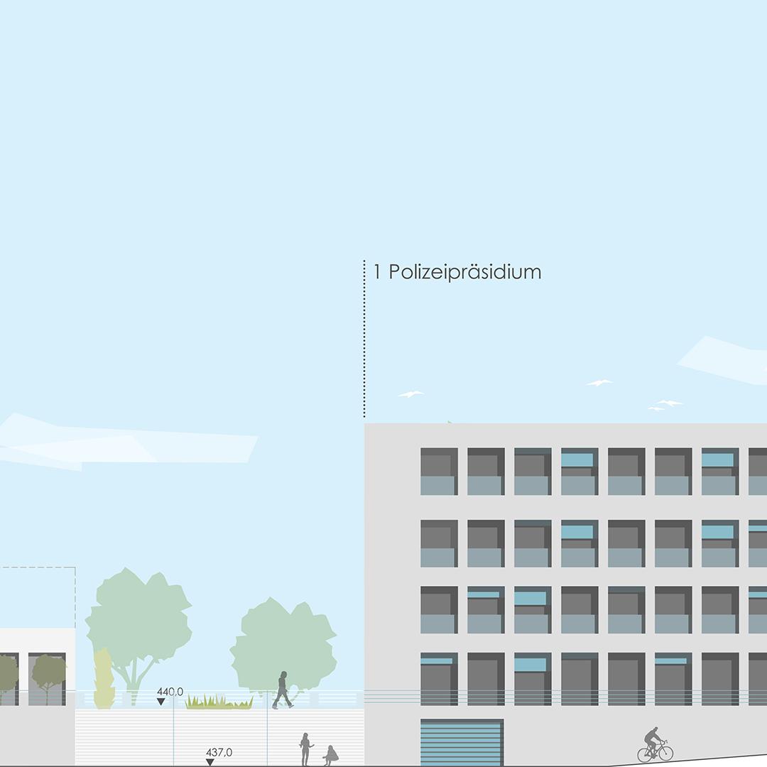 Den Eingang des neuen Ensembles setzen wir an die O.E.W-Straße. Über einen repräsentativen, gut dimensionierten Vorplatz gelangt man in das später Polizeirevier und an der Gebäudeecke in die Eingangshalle des Polizeipräsidiums. Das Polizeipräsidium umschließt einen Hof, der als kommunikativer Raum und für die Pausen genutzt werden kann. Die gewählte Hoftypologie ermöglicht nicht nur einen Rückzugsort angesichts der wenig ansprechenden Nutzungen in der Umgebung, sie garantiert außerdem eine gute Belichtung und eine gute energetische Bilanz. Außerdem werden zahlreiche visuelle Querbezüge ermöglicht, die die Einheit der Polizei unterstreicht.